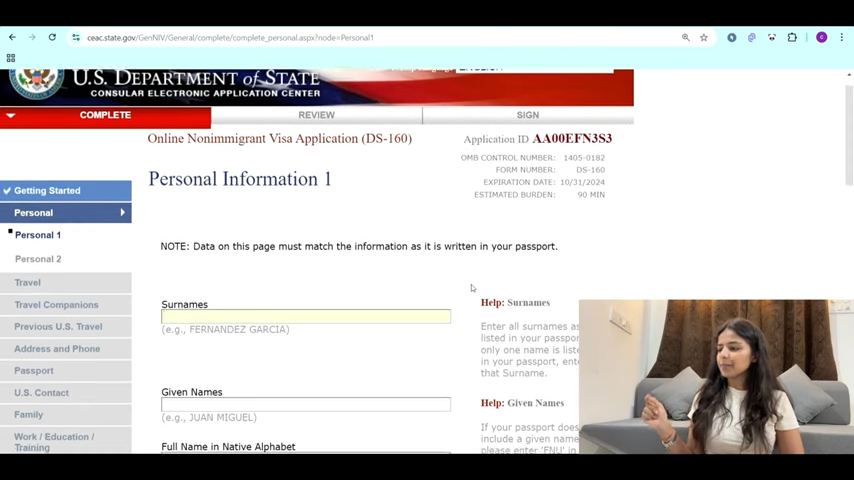 Step 11: Fill in your personal details, including Surname, Given name. Make sure the details exactly match your passport. If you do not have a given name, you may use FNU (First Name Unknown), as shown in the image.