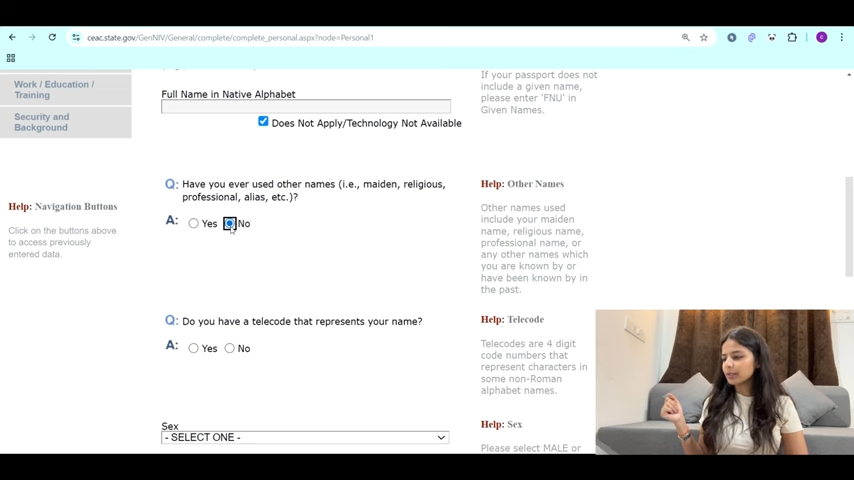 Step 12: Answer the additional questions regarding your Visa Application, such as “Have your used other names“, or “Do you have a telecode that represents your name“, by selecting Yes or No as appropriate.