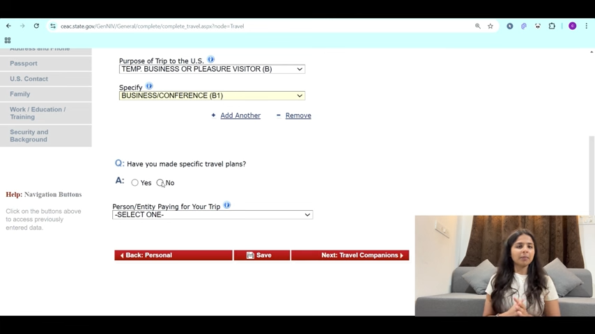 Step 16: Provide your travel details including your visiting purpose to the U.S. For example you may select Businees (B-1), Tourism (B-2) or any other category as per your need. Save your responses.