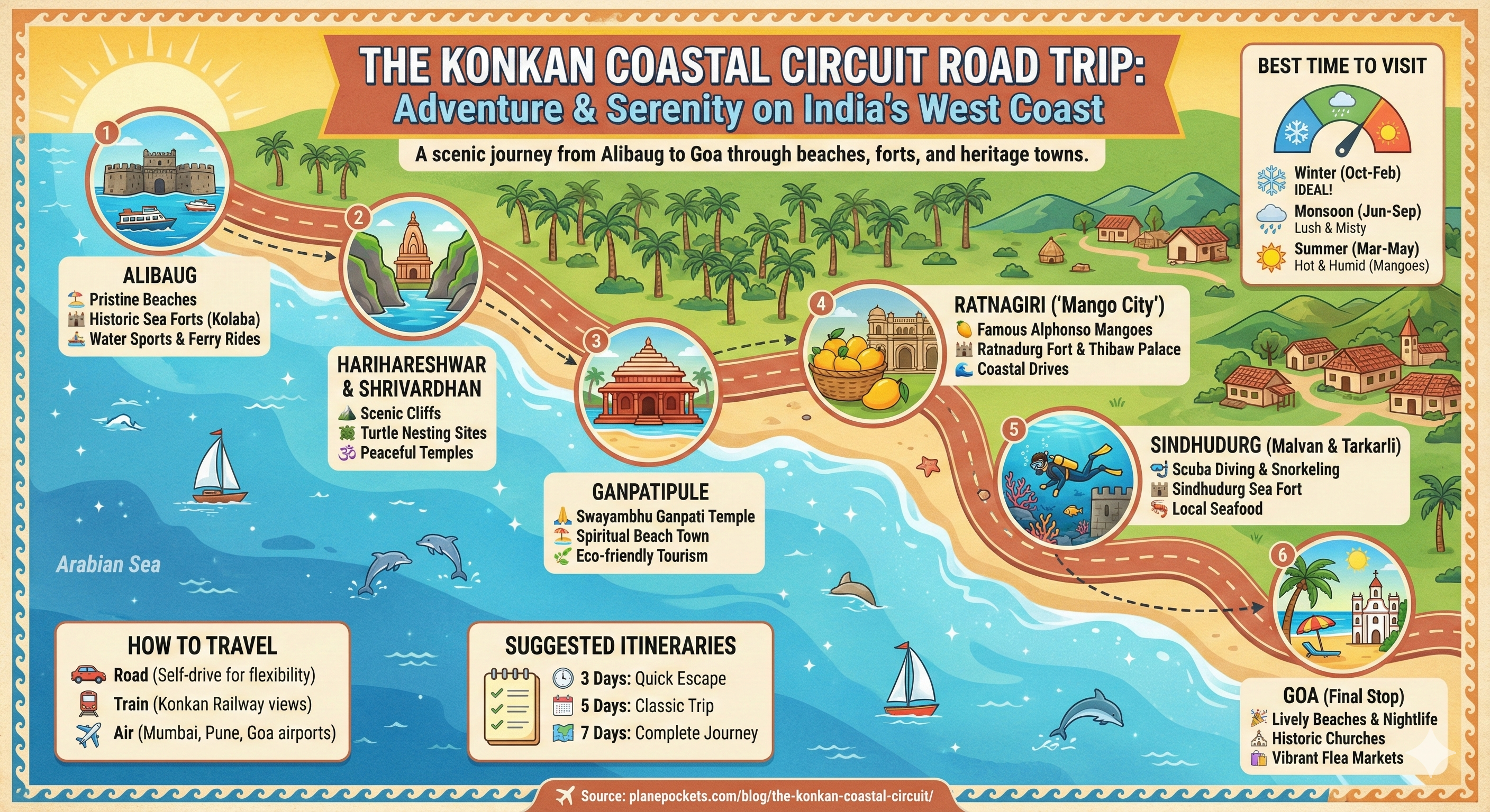 The Konkan Coastal Circuit offers a scenic journey from Alibaug to Goa. It features beaches, forts, temples, and delicious regional cuisine. With a clear road trip itinerary and support from Plane Pockets, you can get smooth and memorable coastal experiences.